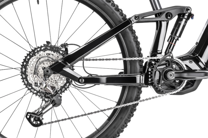 Game, aleación 6061 T4-T6, con 160 mm de recorrido, integración de batería PowerTube de Bosch (horizontal), 12 x 148 mm, potenciador y tecnología de circuito invertido para ajustar la geometría, guardabarros y guía para la cadena